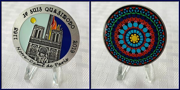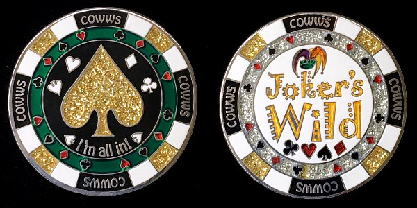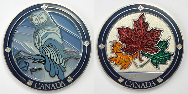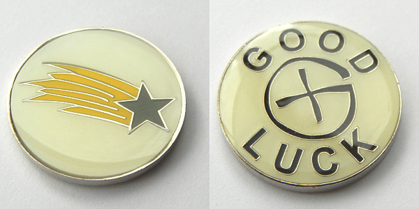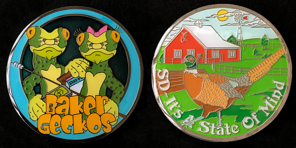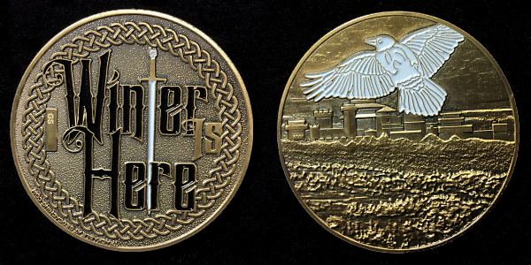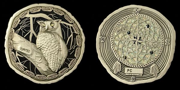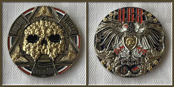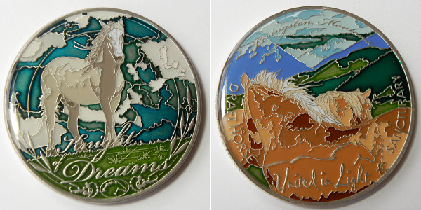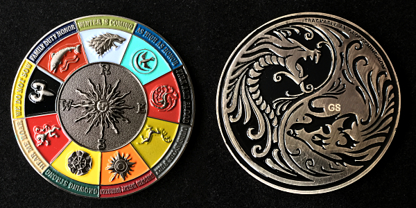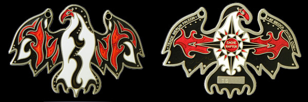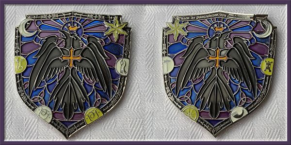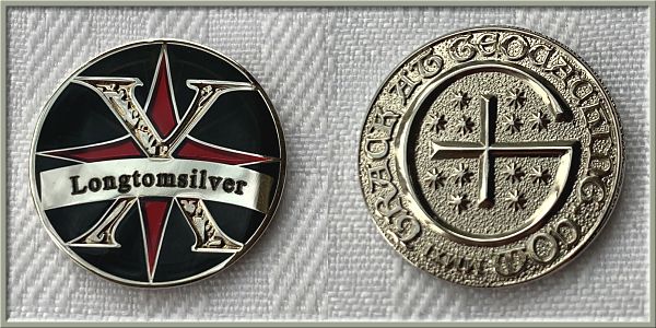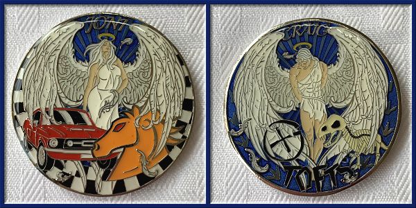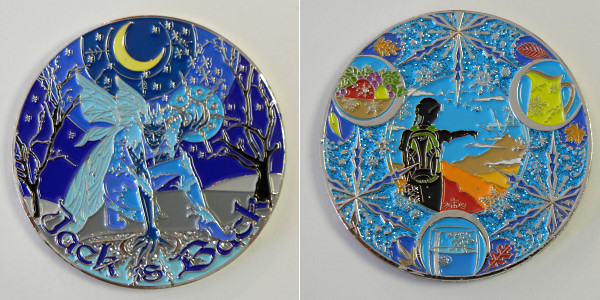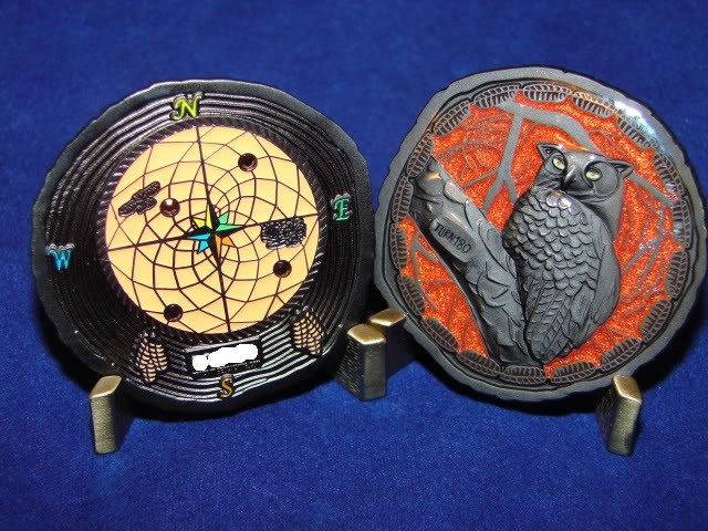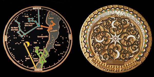 | Guardians of the Night Geocoin Antique Silver with red, white and blue (Freedom Version) and Satin Black Nickel with white glitter. Possibly others, as well. |