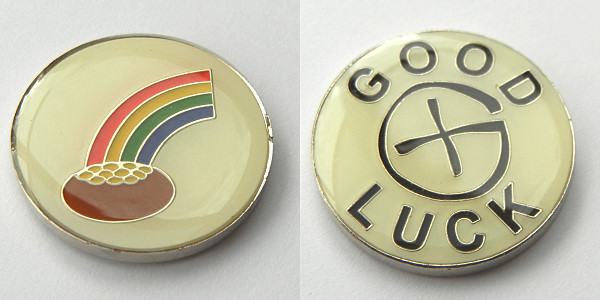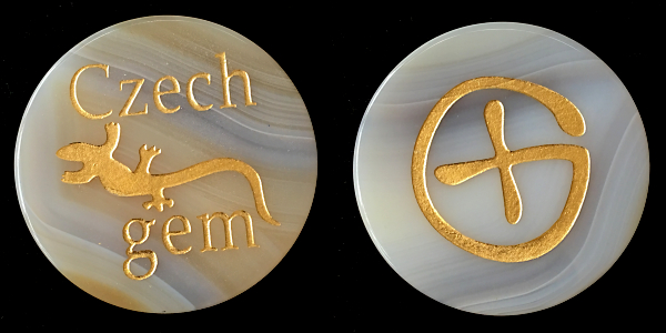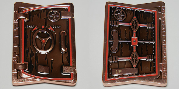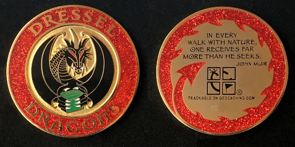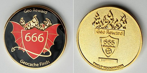 | Plain Geocoin XXLE Matte gold w/ grey & red dots |