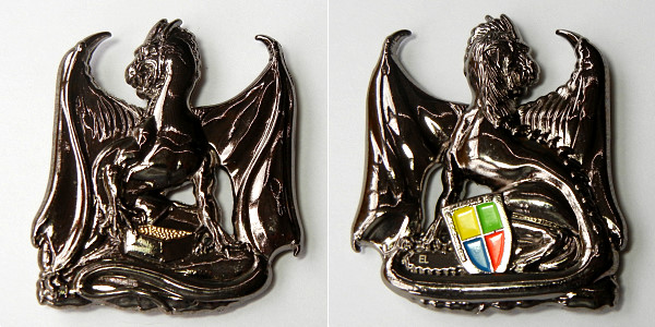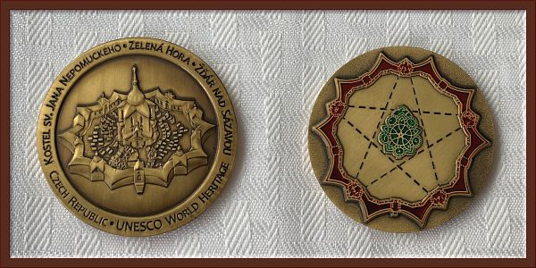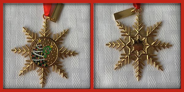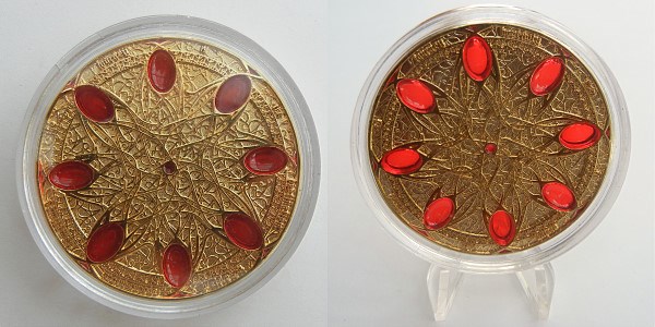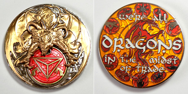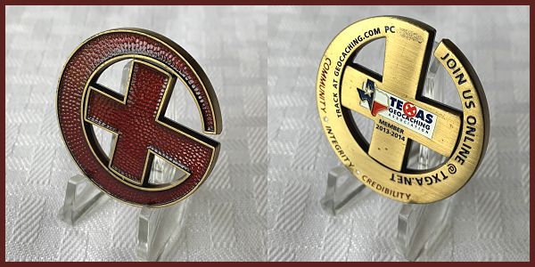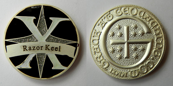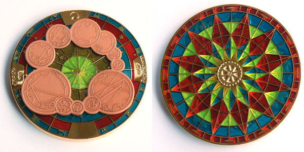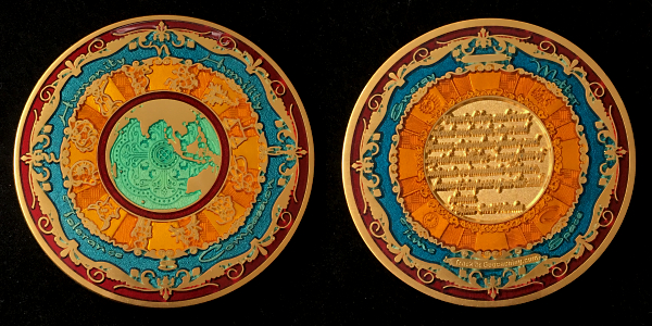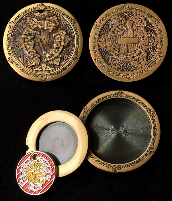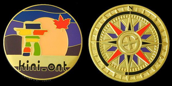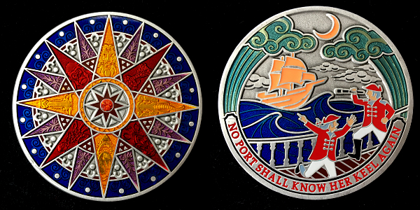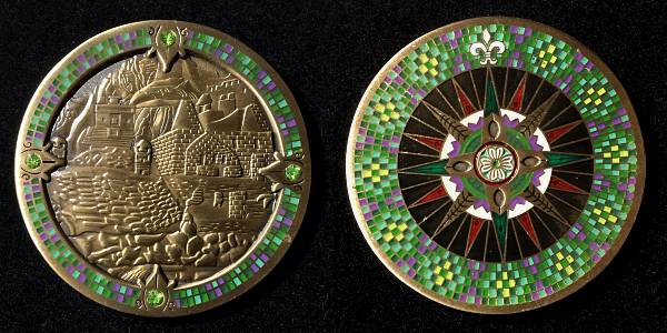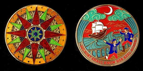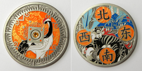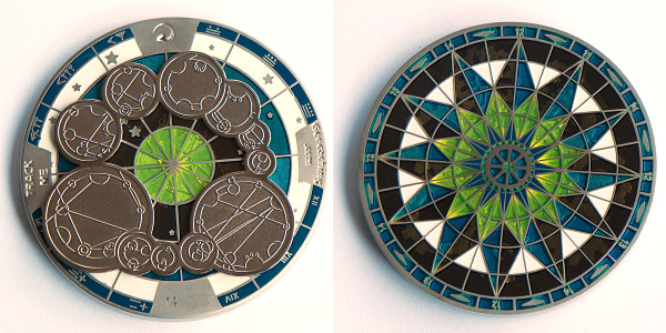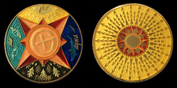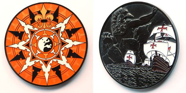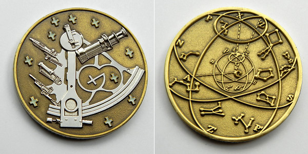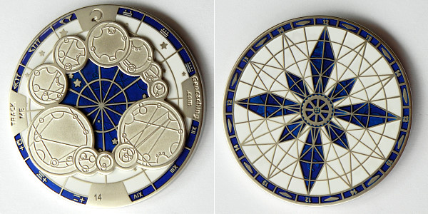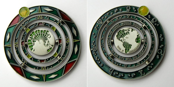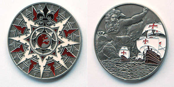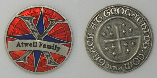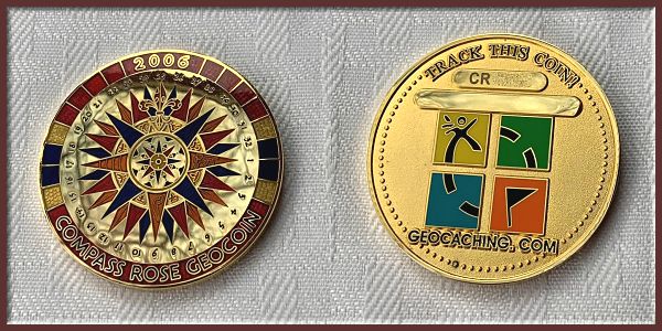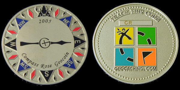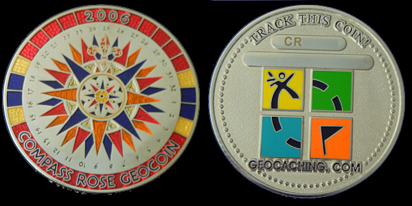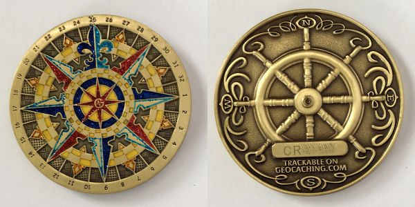 | Compass Rose Geocoin 2009 Antique Bronze with polished nickel and red enamels. |